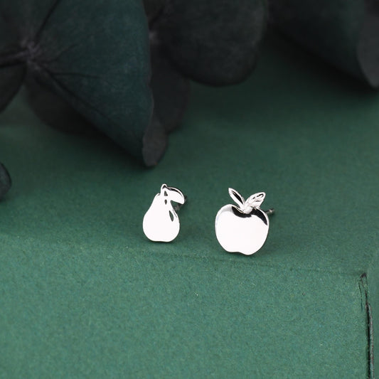 Mismatched Sterling Silver Apple & Pear Stud Earrings – Minimalist Fruit Asymmetric Earrings, Cute Nature Jewellery, Playful Gift for Her