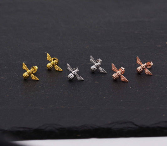 Sterling Silver Cute Little Bumble Bee Stud Earrings, Polished Finish, Quirky and Fun, Adult or Children Jewellery, Gold and Rose Gold Plate