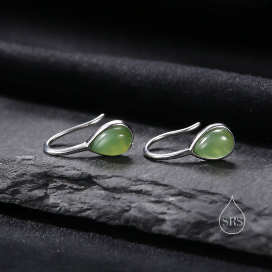 Genuine Green Jade Pear Cut Drop Hook Earrings in Sterling Silver, Delicate Natural Green Jade Earrings, Pear Droplet Green Jade Earrings