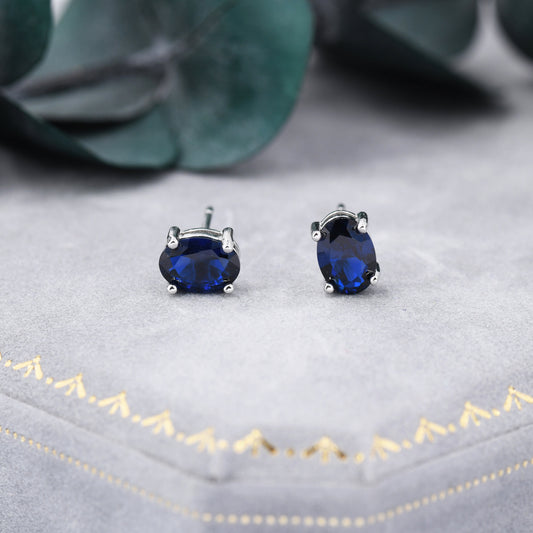 Sapphire Blue Oval CZ Stud Earrings in Sterling Silver, Available in Two Finishes, Oval Cut Crystal Earrings, September Birthstone