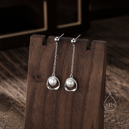 Genuine Freshwater Pearl and Mobius Circle Long Drop Earrings in Sterling Silver, Delicate Keshi Pearl Halo Earrings, Genuine Pearls