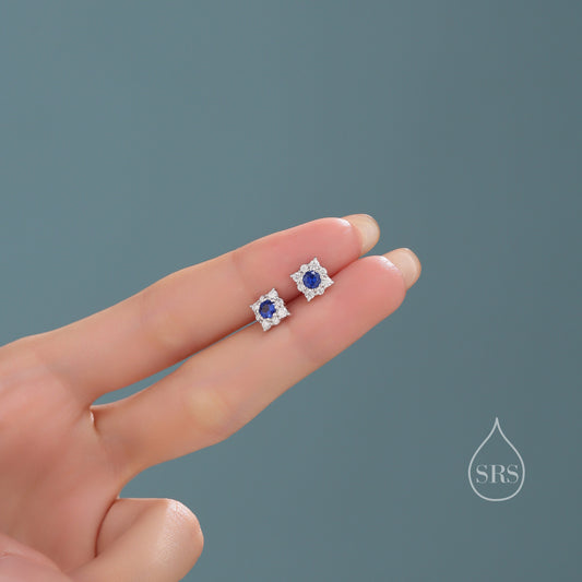Tiny Sapphire Blue CZ Halo Stud Earrings in Sterling Silver, Silver or Gold, Vintage Inspired, Tiny CZ Stud Earrings, September Birthstone
