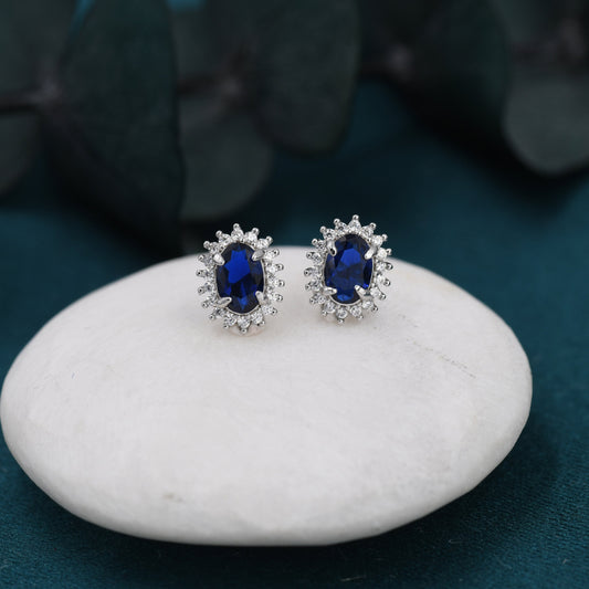Sapphire Blue CZ Stud Earrings in Sterling Silver, Blue Oval Crystal Stud Earrings, September Birthstone