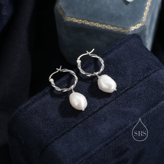 Braided Hoops with Dangling Baroque Pearl Drop Earrings in Sterling Silver, Silver or Gold, Keshi Pearl Twist Hoop Earrings, Pearl Hoops