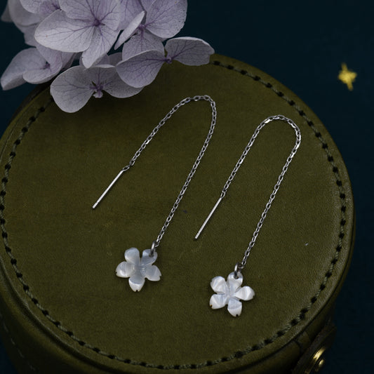 Hand Carved Mother of Pearl Cherry Blossom Threader Earrings in Sterling Silver, Apple Blossom Flower Ear Threaders - Dainty and Pretty
