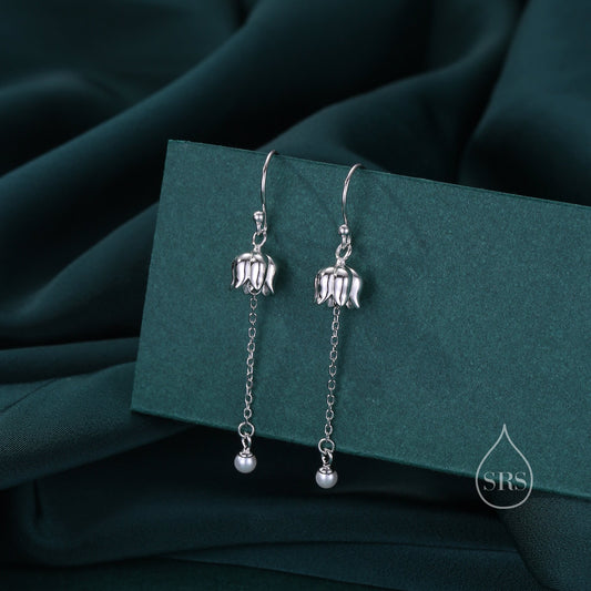 Lily of the valley with Dangle Pearl Dangle Earrings in Sterling Silver, Lily of the Valley Flower Dangle Earrings - Long Chain