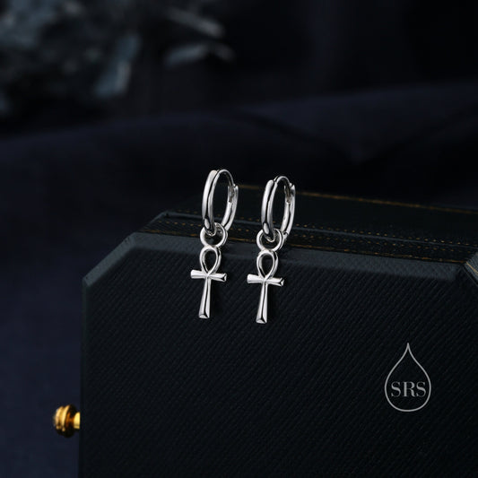 Ankh Huggie Hoop Earrings in Sterling Silver, Silver, Gold or Rose Gold, Egyptian Hieroglyphics Earrings, Ankh Earrings, Detachable Charms