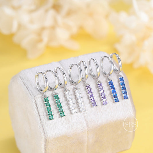 Sale!Sterling Silver Dangle CZ Bars Huggie Hoop Earrings, 8mm Hoops with CZ Bars, Available in 4 Colours, CZ Bar Earrings, Bar Dangle Hoops