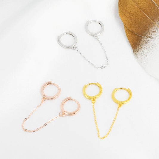 Double Piercing Huggie Hoop Earrings with Chain, Chained Hoop Earrings, Linked Hoops, Linked Hoops