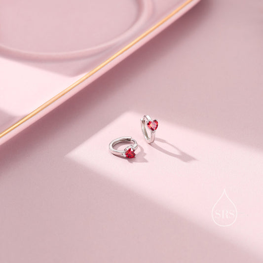 Delicate Garnet Red CZ Heart Huggie Hoop in Sterling Silver, Silver or Gold Garnet Red Hoops, 8mm Inner Diameter, Stacking Earrings