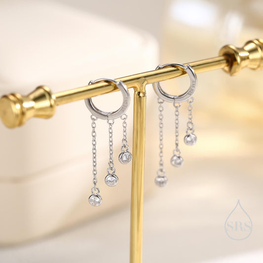 CZ Chain Dangle Huggie Hoop Earrings in Sterling Silver, Silver or Gold, CZ Drop Hoops, Geometric Hoop Earrings