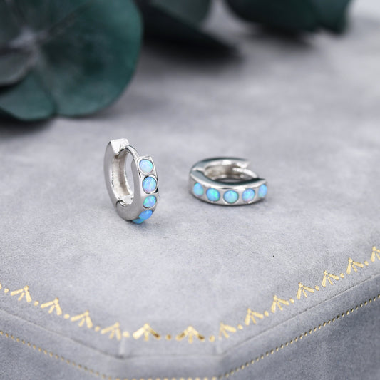 Sterling Silver Opal Huggie Hoop Earrings, Gold Hoop, Blue and White Opal, Minimalist Geometric Hoop Earrings
