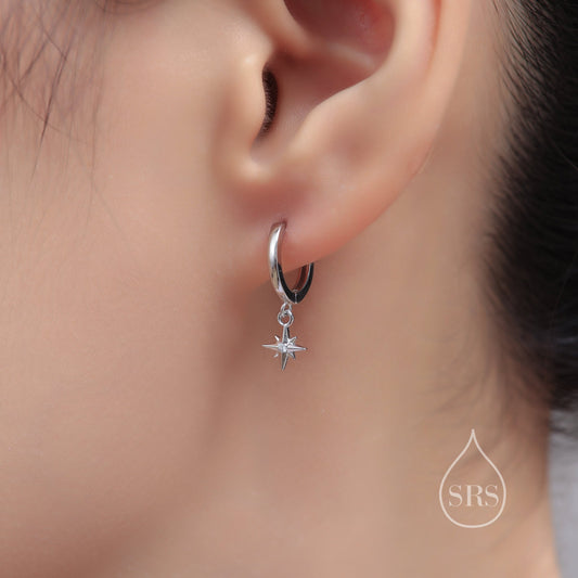 Asymmetric Tiny CZ Starburst Huggie Hoop Earrings in Sterling Silver, Silver, Gold or Rose Gold, North Star Earrings, Sunburst Earrings