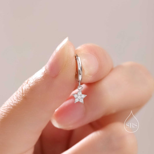 Sparkly CZ Star Huggie Hoop Earrings in Sterling Silver, Aquamarine Blue Star Hoops, North Star Dangle Earrings, Celestial Jewellery