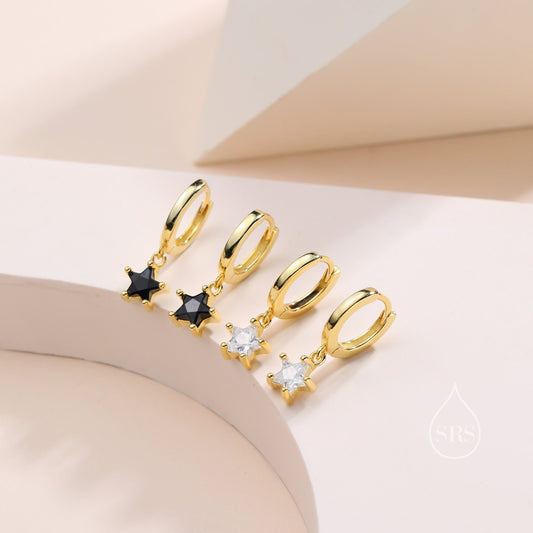 Dangling Starburst Huggie Hoop Earrings in Sterling Silver, Gold or Rose Gold, North Star Charm Earrings, Sunburst Earrings, Celestial