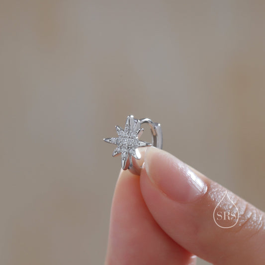 CZ Starburst Huggie Hoop Earrings in Sterling Silver, Silver or Gold, Minimalist North Star Earrings, Sunburst Earrings, Celestial