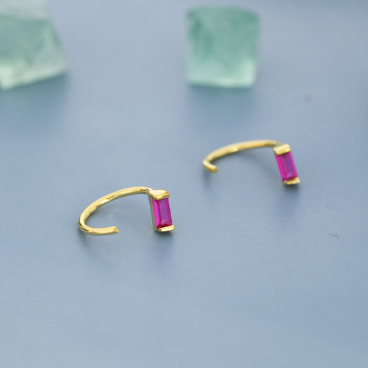 Ruby Pink Baguette Cut CZ Huggie Hoop Earrings in Sterling Silver, Silver or Gold, Open Hoops, Pull-Through Threader Earrings, Ruby Red