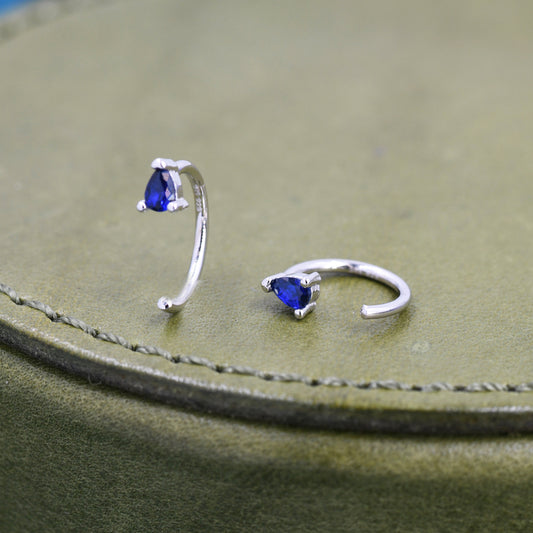 Sapphire Blue CZ Droplet Huggie Hoop Earrings in Sterling Silver, Tiny Blue Pear Cut CZ Open Hoops, Pull Through Threaders, Half Hoops
