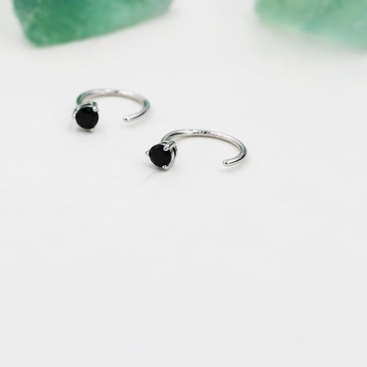 Black CZ Huggie Hoop Earrings in Sterling Silver, Tiny Black Open Hoops, Three Prong, Pull Through Threaders, Half Hoops
