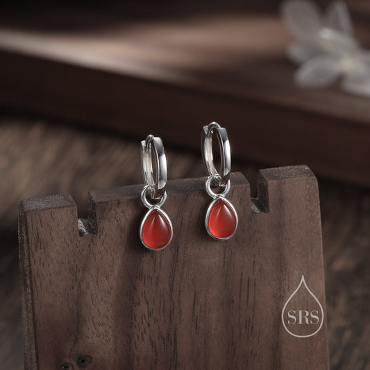 Sterling Silver Genuine Red Carnelian Droplet Hoop Earrings, Detachable Pear Shape Red Onyx Dangle Hoop Earrings, Interchangeable