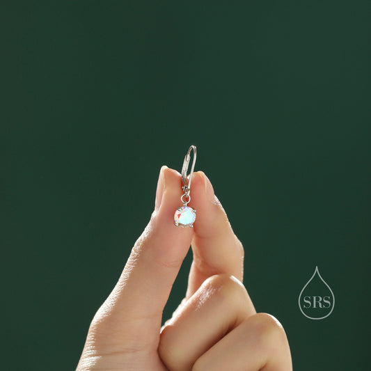 Sterling Silver Hoops with Tiny Dangling 3mm Moonstone, Very Small Lab Moonstone Charm Dangle Hoop Earrings, Silver or Gold