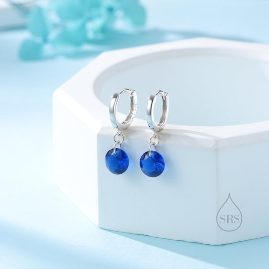 Dangle Sapphire Blue CZ Huggie Hoop Earrings in Sterling Silver, Silver or Gold, Delicate Sparky CZ Skinny Hoops, Dark Blue Crystal Hoops