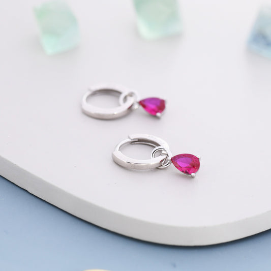 Sterling Silver Ruby Red CZ Droplet Hoop Earrings, Silver, Gold or Rose Gold, Pear Cut Drop Earrings, Interchangeable Charms, July