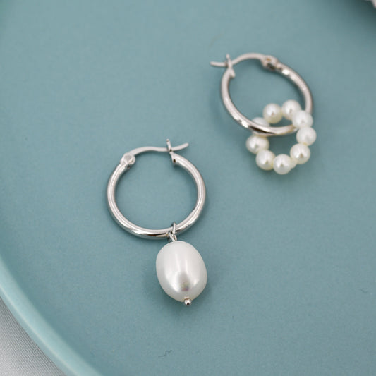 Mismatched Detachable Pearl Dangle Hoop Earrings in Sterling Silver, Silver or Gold, 14mm Hoops, Simple Hoop Earrings