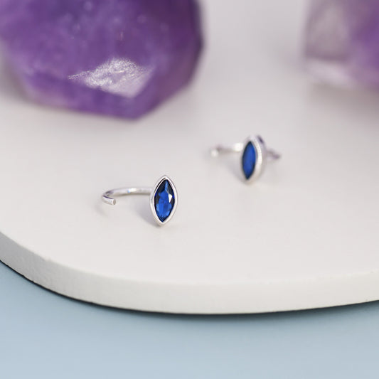 Marquise Sapphire Blue CZ Huggie Hoops in Sterling Silver, Marquise Crystal Open Threader Earrings, Half Hoops, September Birthstone