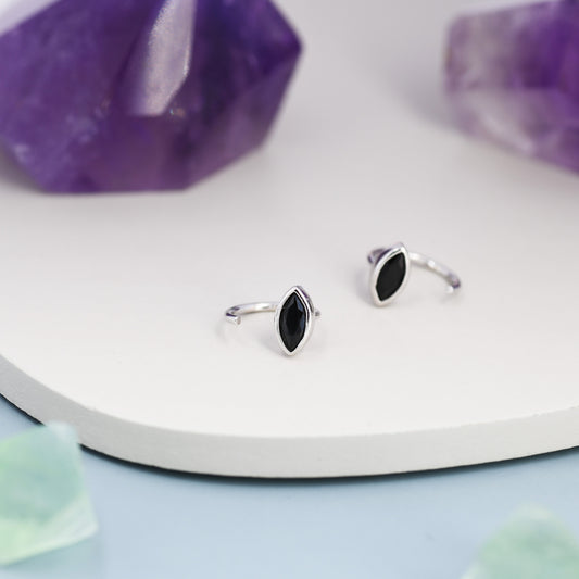 Marquise Black CZ Huggie Hoops in Sterling Silver, Marquise Crystal Open Threader Earrings, Half Hoops, Black Diamond