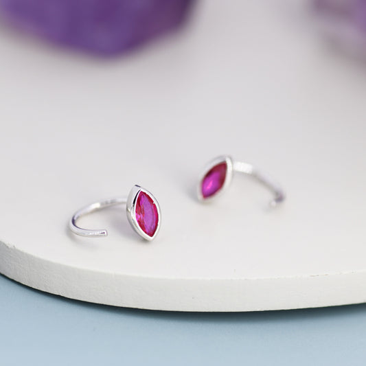 Marquise Ruby Pink CZ Huggie Hoops in Sterling Silver, Marquise Crystal Open Threader Earrings, Half Hoops, July Birthstone