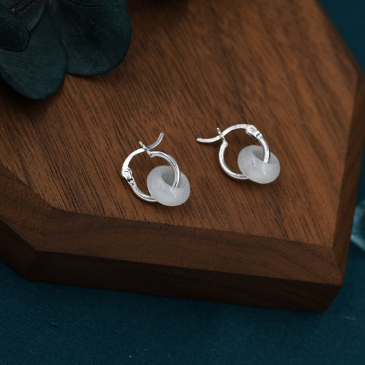 Sterling Silver White Jade Donut Huggie Hoop Earrings, Detachable Natural White Jade Coin Charm Dangle Hoop Earrings, Silver or Gold