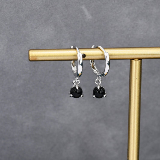 Sterling Silver 4mm Black Onyx Hoop Earrings, Natural Black Onyx Dangle Hoop Earrings, Silver or Gold