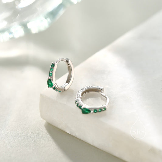 Dainty Green CZ Huggie Hoop Earrings in Sterling Silver with Pear CZ, Silver or Gold, Droplet CZ Hoops