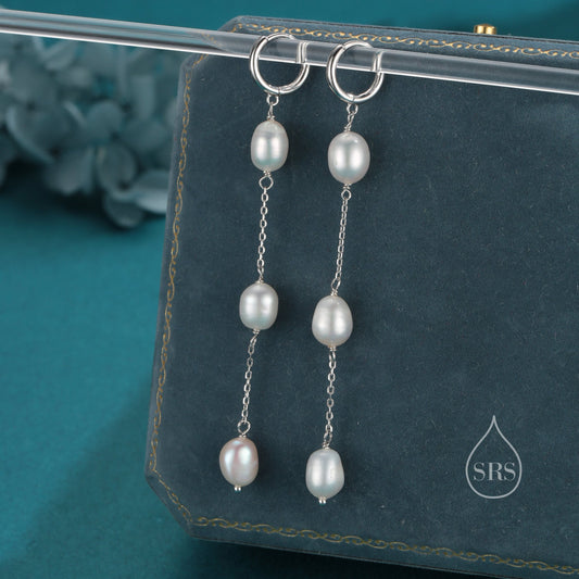 Natural Oval Pearl Trio Long Dangle Huggie Hoop Earrings in Sterling Silver, Silver or Gold or Rose Gold, Genuine Freshwater Pearls