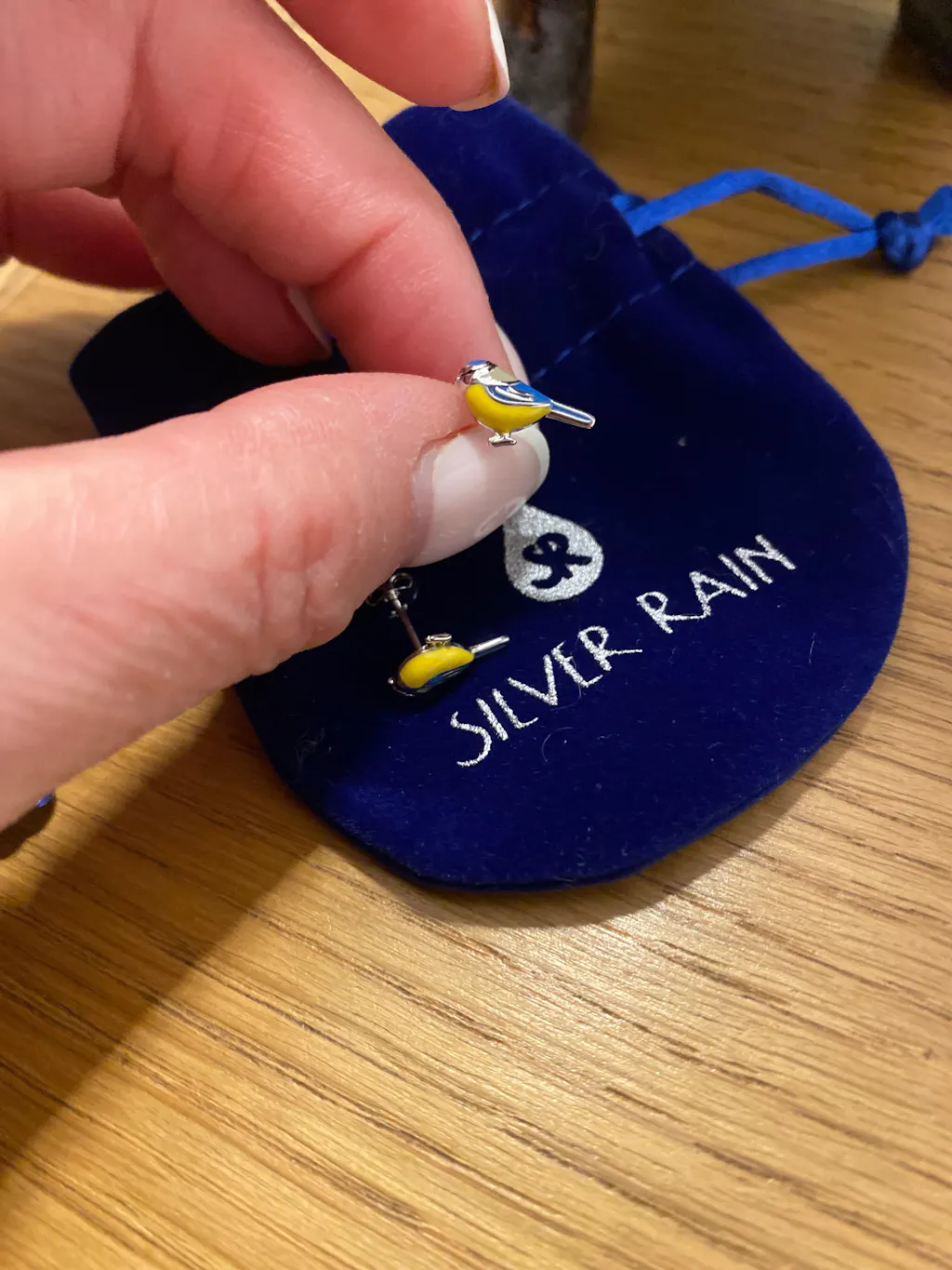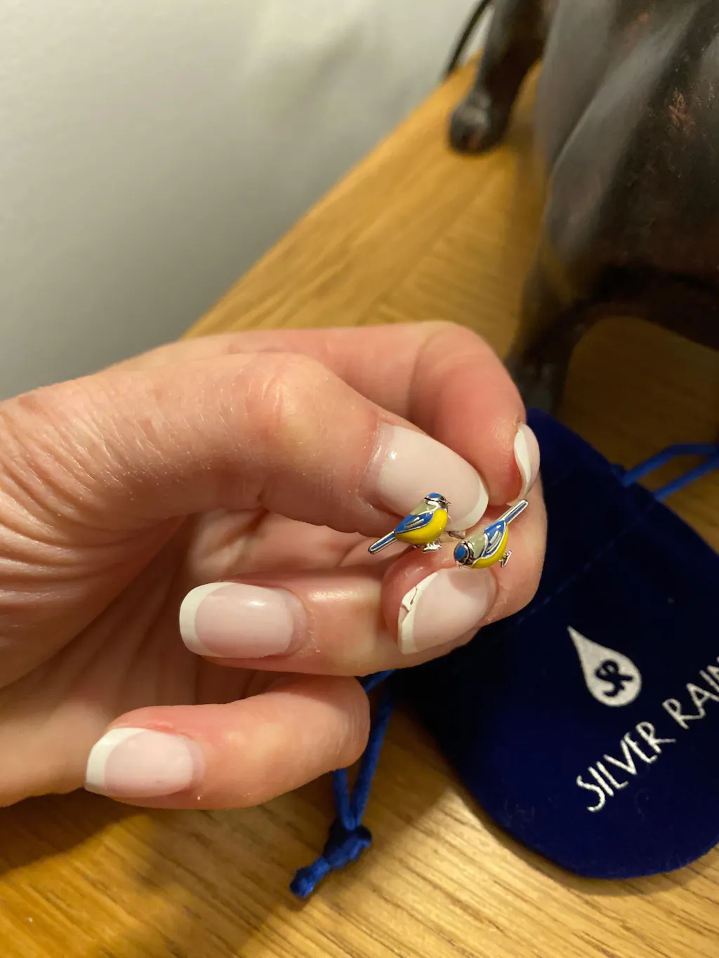 Blue Tit Bird Stud Earrings in Sterling Silver, Silver Blue Tit Earrings, Hand Painted Enamel Blue Tit Earrings, Animal Earrings, Bird Stud