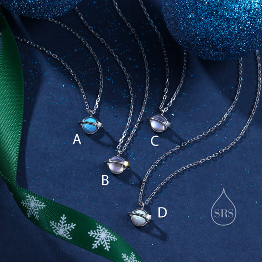 Tiny Planet Pendant Necklace in Sterling Silver with Opal or Moonstone, Silver or Gold, Opal Saturn Necklace, Space Necklace