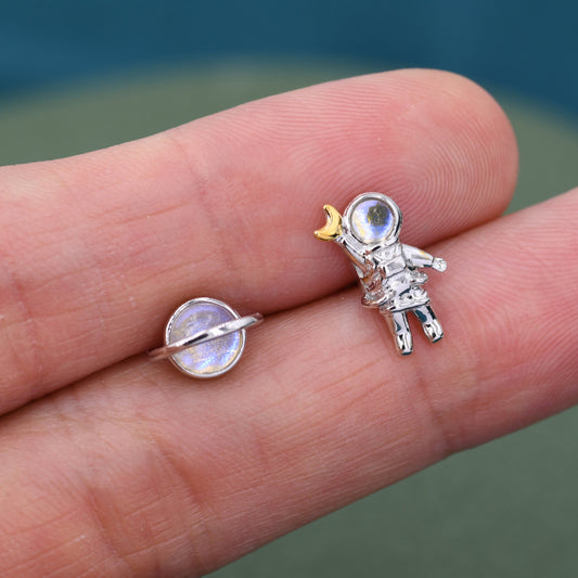Mismatched Astronaut and Planet Stud Earrings in Sterling Silver, Asymmetric Planet and Spaceman Earrings with Moonstone, Cute and Fun