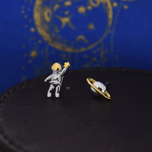 Mismatched Astronaut and Planet Stud Earrings in Sterling Silver, Silver or Gold, Asymmetric Planet and Spaceman Earrings, Fun and Quirky
