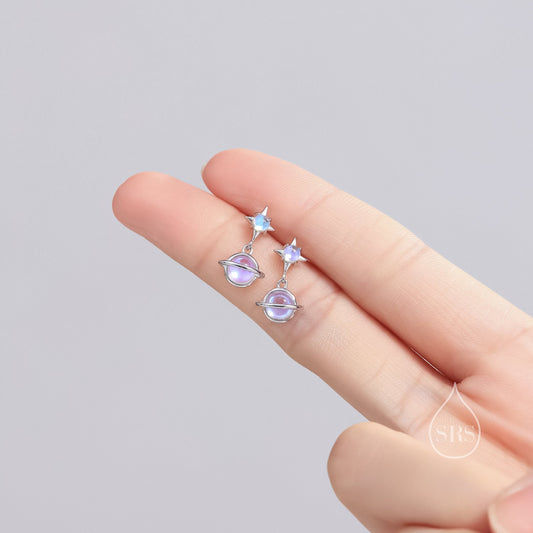 Moonstone Planet with Starburst Stud Earrings in Sterling Silver, Lab Moonstone Saturn Earrings, Silver or Gold, Planet Earrings