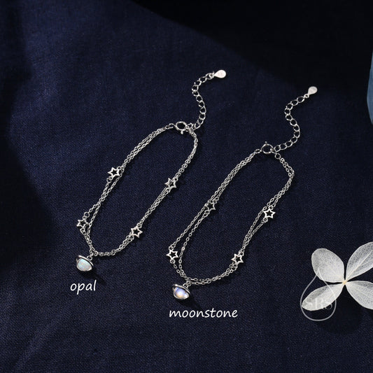 Double Layer Moonstone Star Trio Bracelet in Sterling Silver, Silver or Gold, Simulated Moonstone Star Bracelet, Two Layer Star Bracelet
