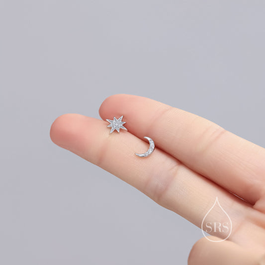 Asymmetric Moon and Starburst Stud Earrings, Silver, Gold or Rose Gold, Star Stud Earrings, Petite Celestial Earrings