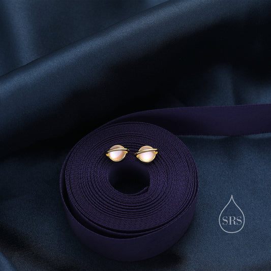Moonstone Planet Stud Earrings in Sterling Silver, Lab Moonstone Planet Earrings, Opal Saturn Earrings
