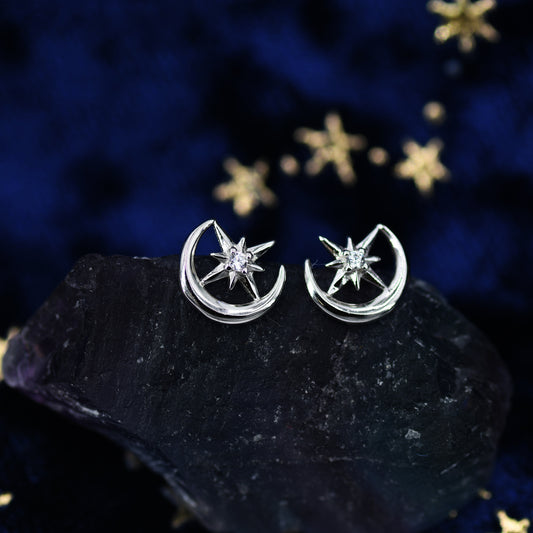 Delicate Moon and Star Stud Earrings in Sterling Silver, Silver, Gold or Rose Gold, Small Moon Earrings, Celestial Jewellery