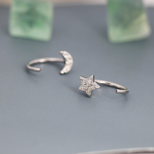 Asymmetric Tiny Moon and Star CZ Huggie Hoop Earrings in Sterling Silver, Silver, Gold or Rose Gold, Open Threader, Threader Hoop