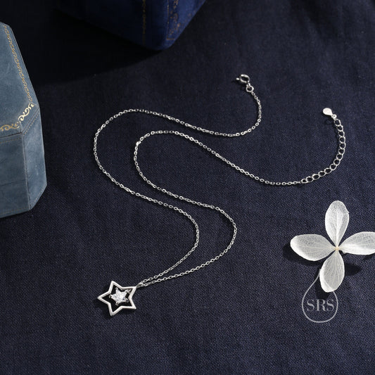 CZ Star Pendant Necklace in Sterling Silver, Silver or Gold, Open Star Halo Necklace