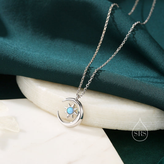 Blue Opal Moon and Star Pendant Necklace in Sterling Silver, Silver or Gold, Aurora Star Necklace, Lab Opal Starburst, Moon and Sun