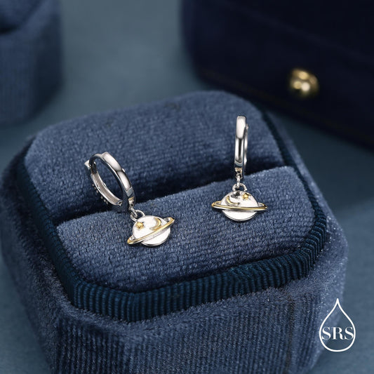 Planet and Gold Star Huggie Hoop Earrings in Sterling Silver, Saturn Dangle Hoop Earrings