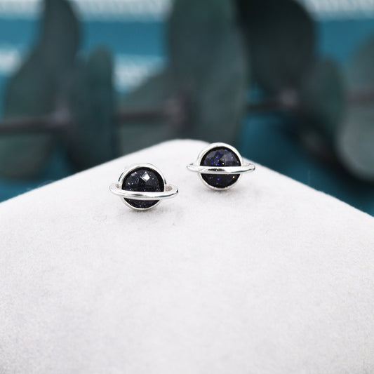 Genuine Blue Sandstone Planet Stud Earrings in Sterling Silver, Blue Goldstone Planet Earrings, Blue Saturn Earrings