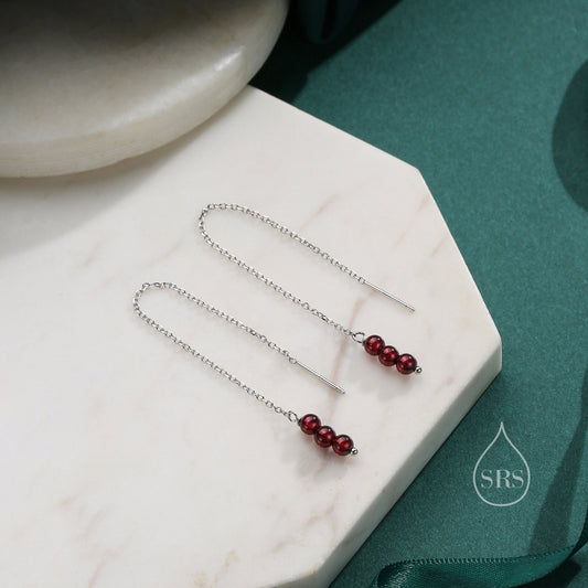 Genuine Garnet Gemstone Ear Threaders in Sterling Silver, Three Beads Threader Earrings, Ear Jacket, Red Garnet Crystal Earrings